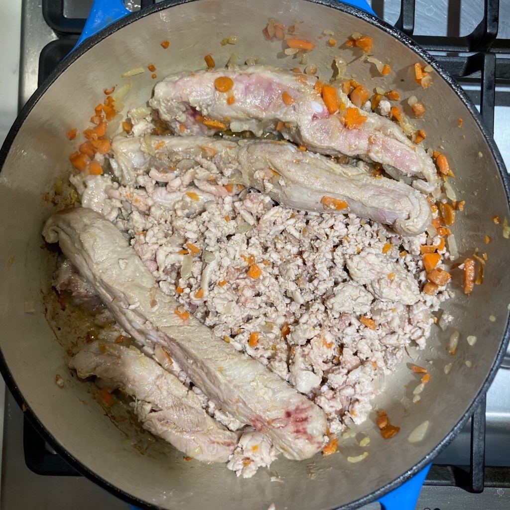 • Add Sausage and Ground Pork. Add 1lb(450g) ground pork, 1/4 lb(110g) Italian pork sausage without casing, and a small amount of salt to the pot and mix it through. Cook the mixture until all the meat has taken on color (see below).