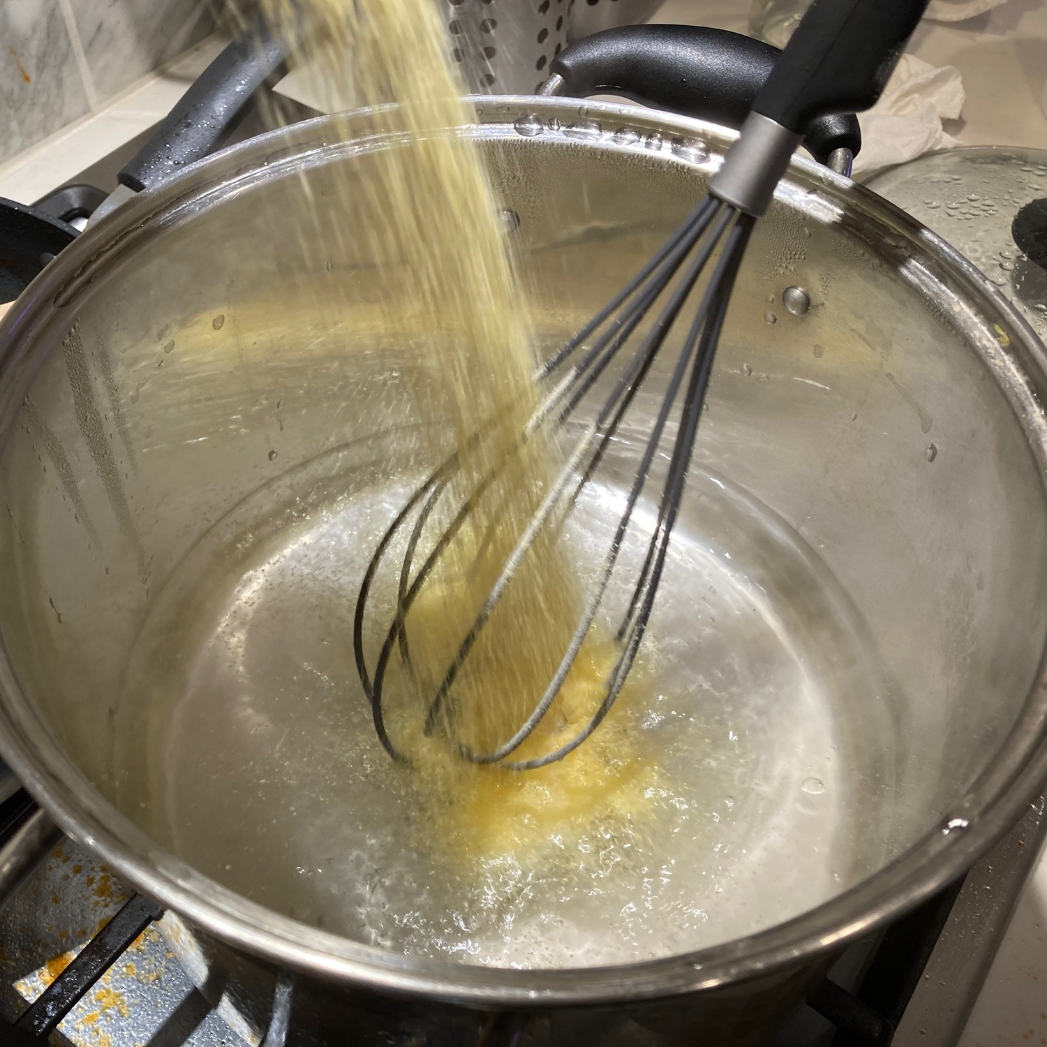 - 混入粗玉米粉。水沸腾后,用手持搅拌器缓缓混入2杯(475ml)粗玉米粉。边倒入边搅拌,这样可以防止玉米粉过早结坨。所有玉米粉必须均匀地与沸水混合。然后加入足够多的现磨黑胡椒粉,搅拌均匀。转中火。