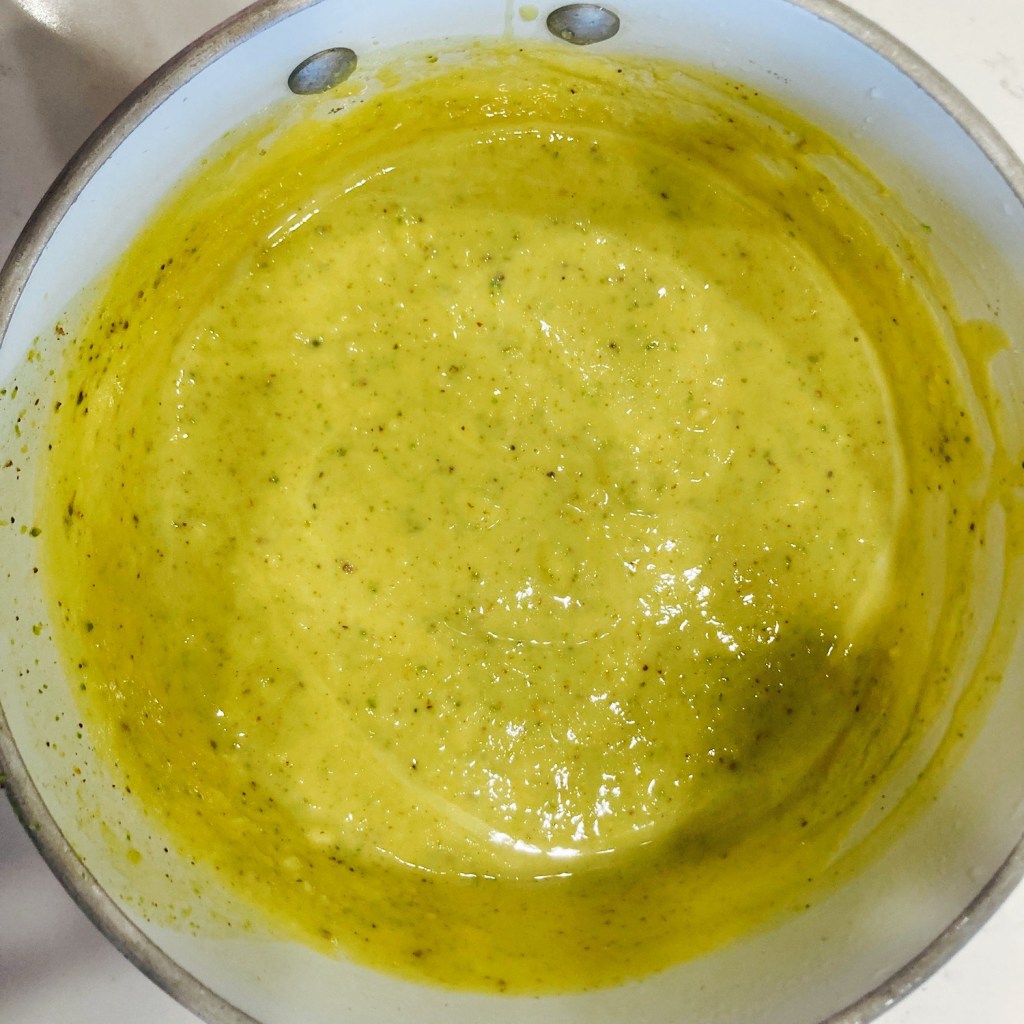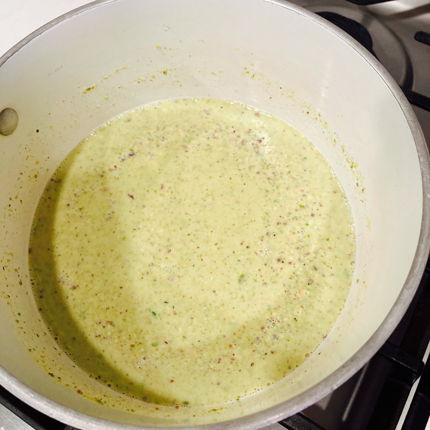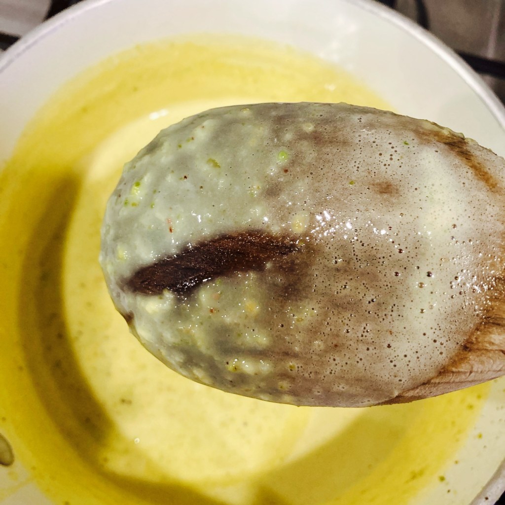 - Scald Milk and Prepare Gelato Base. Add the 2 cups(480ml) of 2% milk and crushed pistachios to a medium size pot. Heat over medium heat, stirring lightly (see top left picture below). Once small bubbles form at the edge of the pot, take off the heat. While whisking the egg yolk+sugar mixture, slowly and carefully add half of the milk+pistachio mixture to the egg yolks. The point of adding this slowly while whisking is to not scramble the egg yolks. Then add the egg yolks mixture back to the pot (the one containing the other half of the milk+pistachio mixture, see top right image below) and heat over medium low while stirring gently. Cook until the mixture coats the back of a spoon (about 5 to 8 minutes). This is when you can draw a line through the mixture on the back of the spoon as shown in the bottom left image below. Take pot off the heat and refrigerate overnight. The mixture should be thick and have strong pistachio color, see bottom right image below.