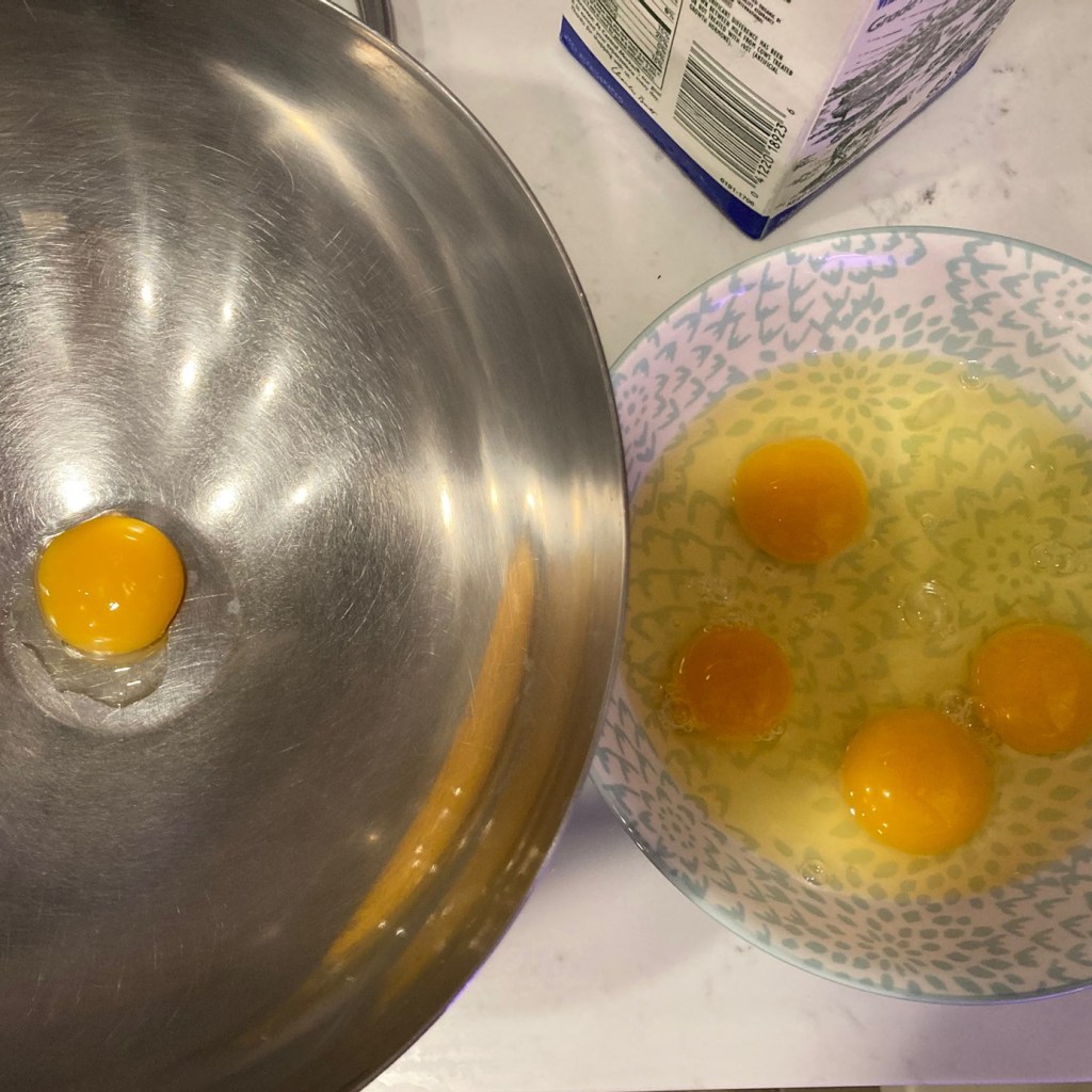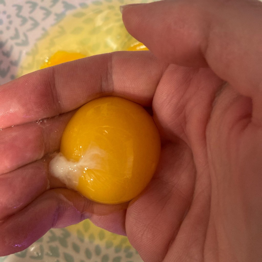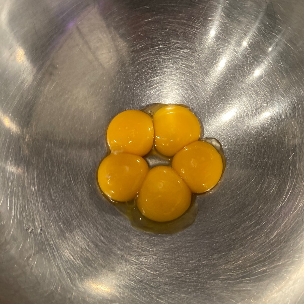 - Separate egg yolks. Separate the yolks from 5 eggs and place in a bowl. Whites can be set aside for another use or discarded. Below is a technique for doing this that I use, but use any technique that works for you. This works best when the eggs are still cold. Crack the five eggs into a small bowl. Use your hand to reach in and lift out one egg yolk. Pass the egg yolk from hand to hand gently over the small bowl until all the whites have fallen off and only the yolk remains in your hand. Place the yolk into a mixing bowl. Repeat with other eggs. See the row of three images below to see this process.