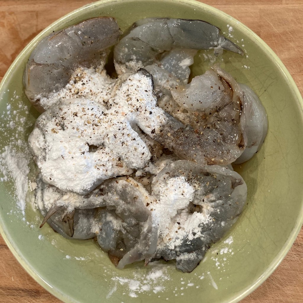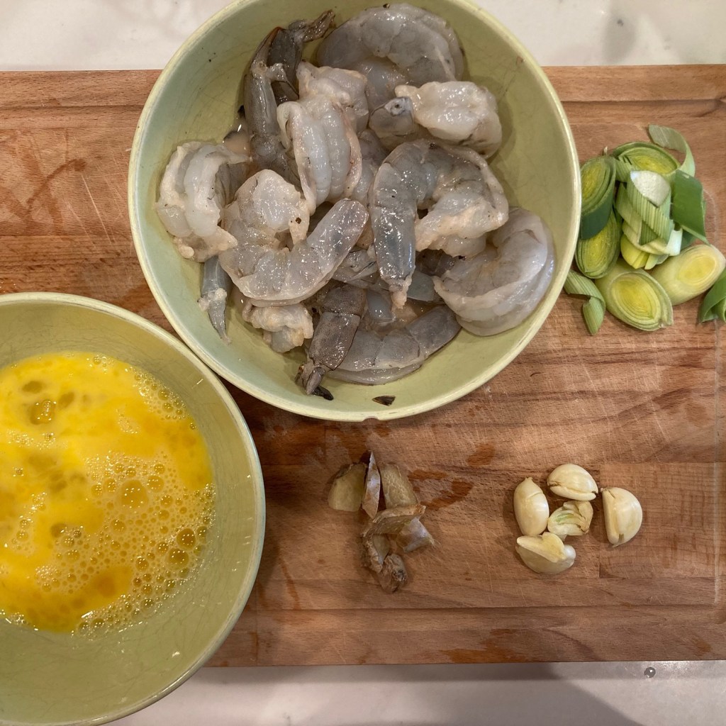 • Shrimp. Thaw, peel and devein 14-16 shrimps if shrimps are not already deveined. Mix them with 1-2 tablespoons of Shaoxing wine, 1-2 tablespoons of corn starch and some salt and pepper and marinate for 5-10 minutes. See the top two pictures below.