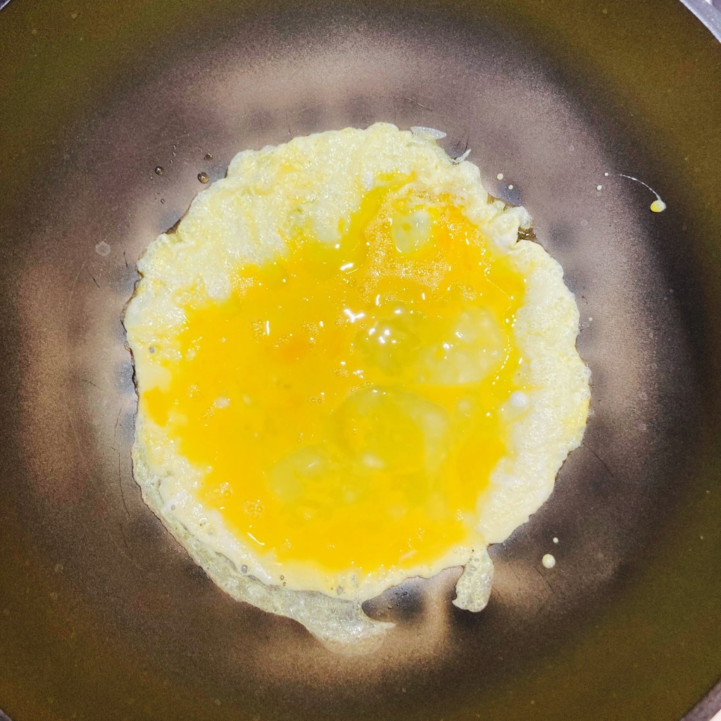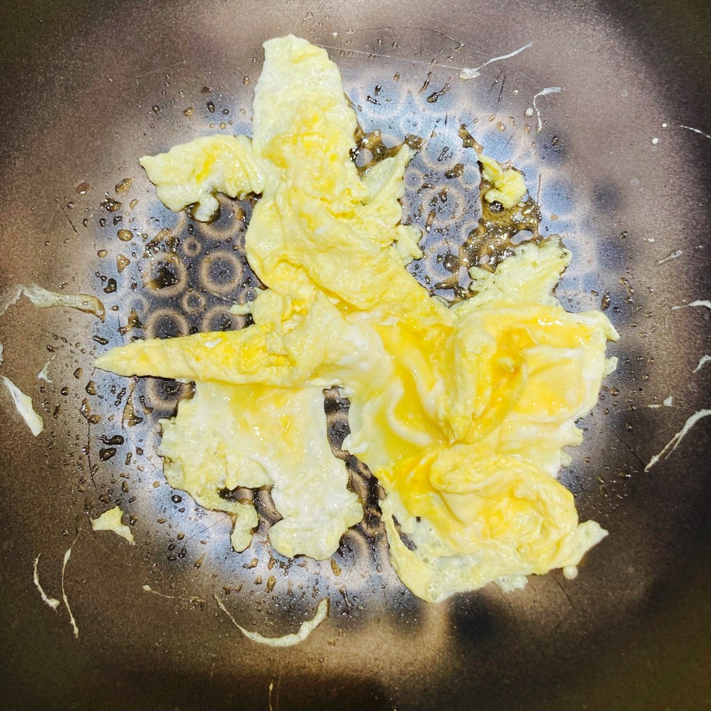 • Scramble eggs. Heat a wok or a large pan on medium high heat. Once the wok is hot, add 1-2 tablespoons (15-30ml) of olive oil (or neutral flavor oil) and the beaten eggs. Quickly stir fry it to prevent overcooking. Set the scrambled egg aside when there is still some liquid in it (We will re-fry the eggs later so we keep the eggs a bit undercooked for now).