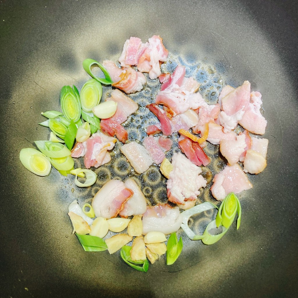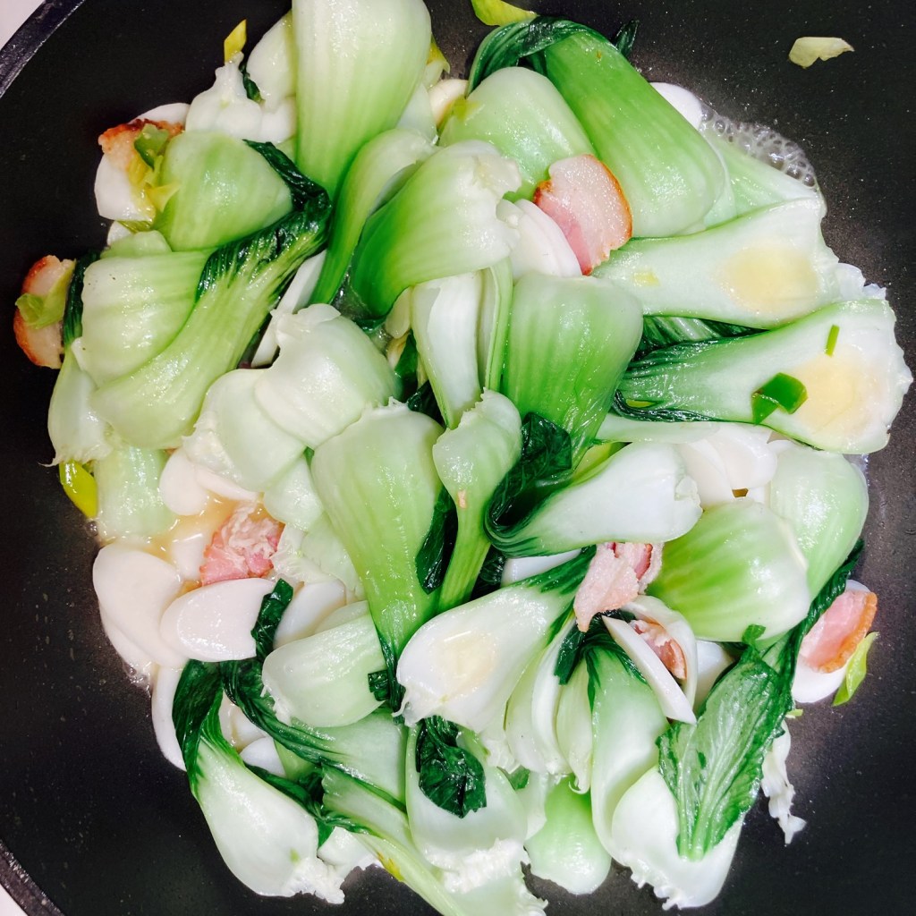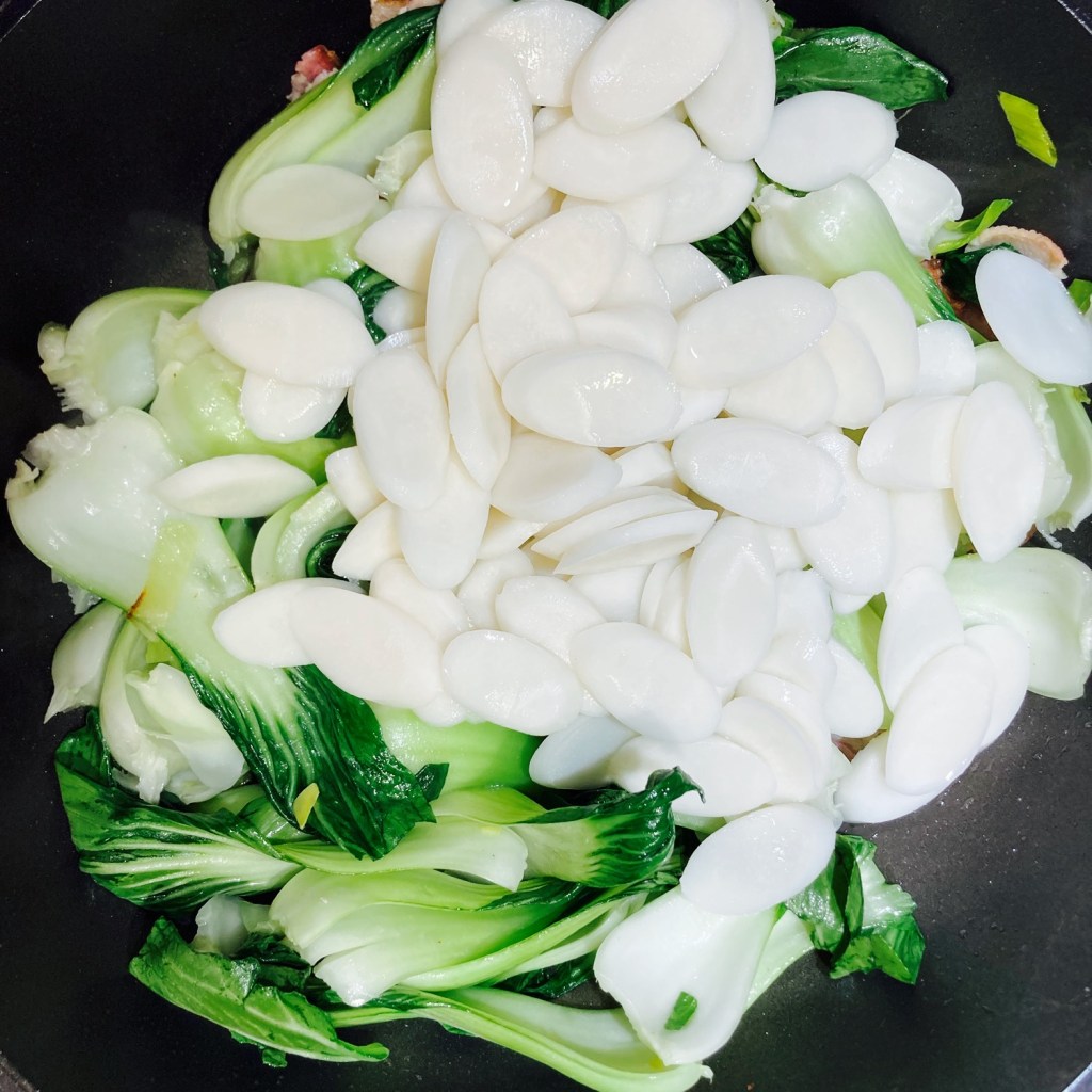 • Stir fry veggies and rice cakes. Same wok or pan with medium heat. Add all(2 slices/30g) of the chopped bacon, all of the ginger slices and chopped green onion/leeks. Sauté 1-2 min until fragrant. Then add the Bok Choy leaves to mix with the bacon mixture until softened like the bottom left picture. Then add all the rice cakes and mix well.