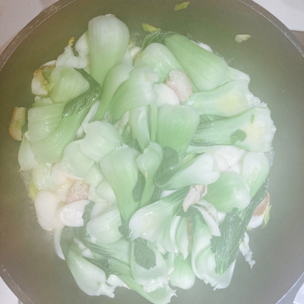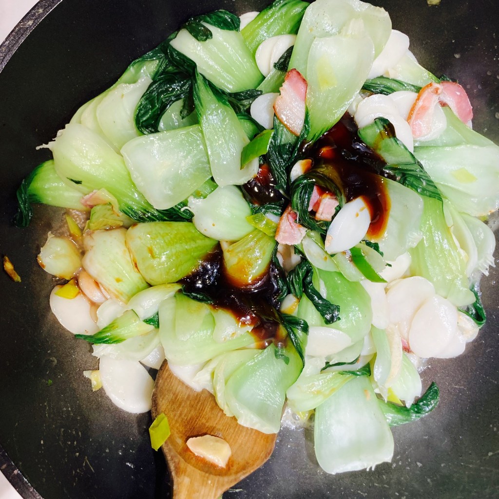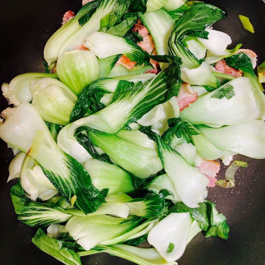 • Stir fry veggies and rice cakes. Same wok or pan with medium heat. Add all(2 slices/30g) of the chopped bacon, all of the ginger slices and chopped green onion/leeks. Sauté 1-2 min until fragrant. Then add the Bok Choy leaves to mix with the bacon mixture until softened like the bottom left picture. Then add all the rice cakes and mix well.