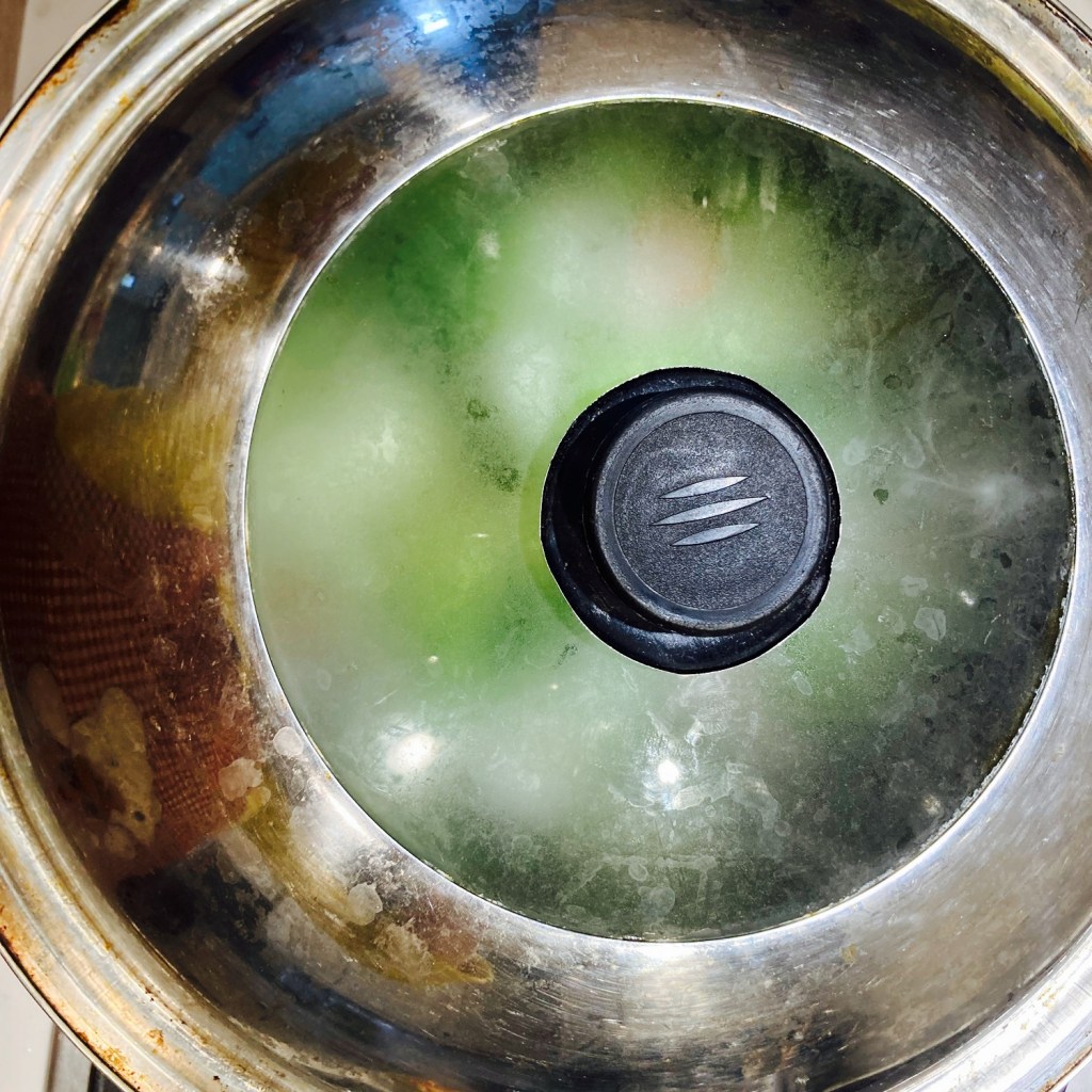 • Boil rice cakes. Pour in the half cup(120ml) of low sodium chicken stock and cover the wok with a lid as shown in pictures below and adjust to medium heat if not already there. Let rice cakes be boiled for about 3 minutes to fully absorb all the flavors from chicken stock and bacon.