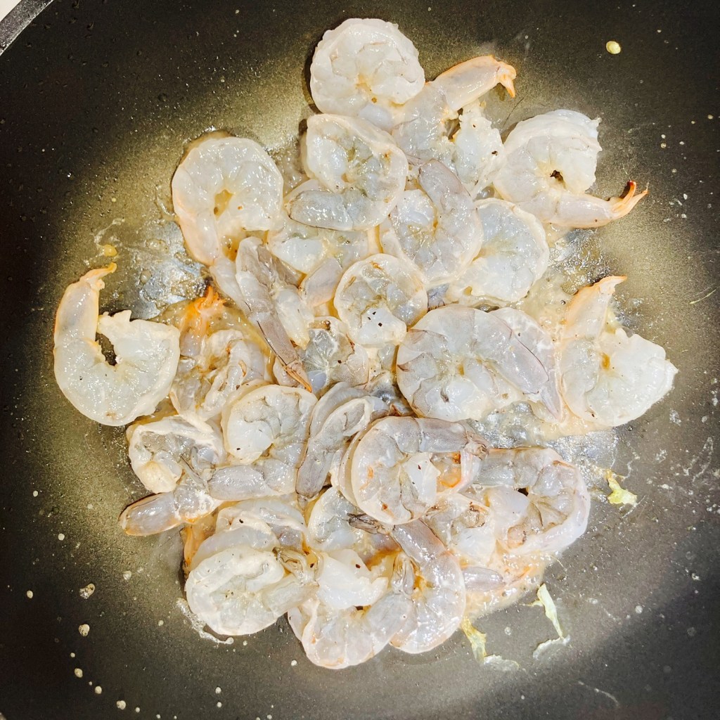 • Sauté shrimp. Same wok or pan. Medium high heat. Add one more tablespoon(15ml) of olive oil if needed. Add in the marinated shrimp and quickly stir fry them. Once the shrimps turn gold (see bottom right picture), immediately turn off heat and take the shrimp out to prevent overcooking. We will keep shrimps a bit uncooked due to the same reason as the scrambled egg.